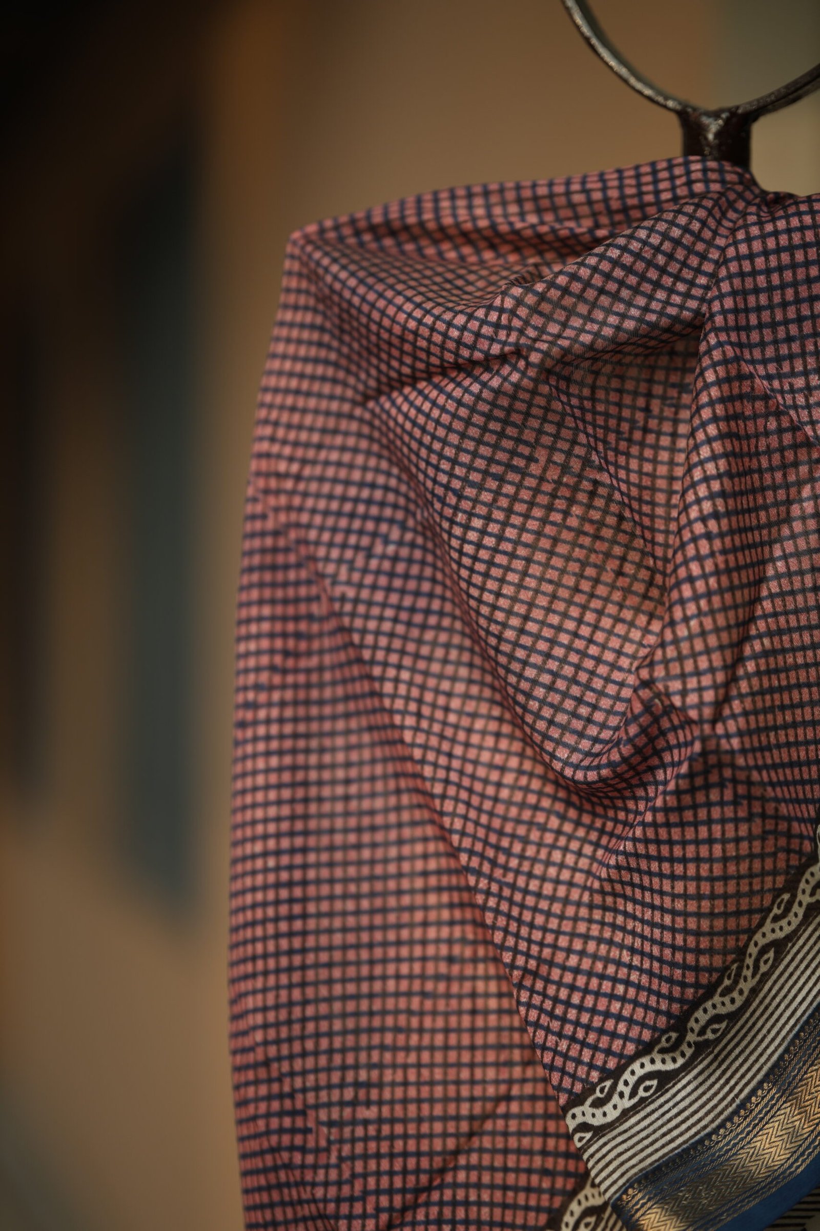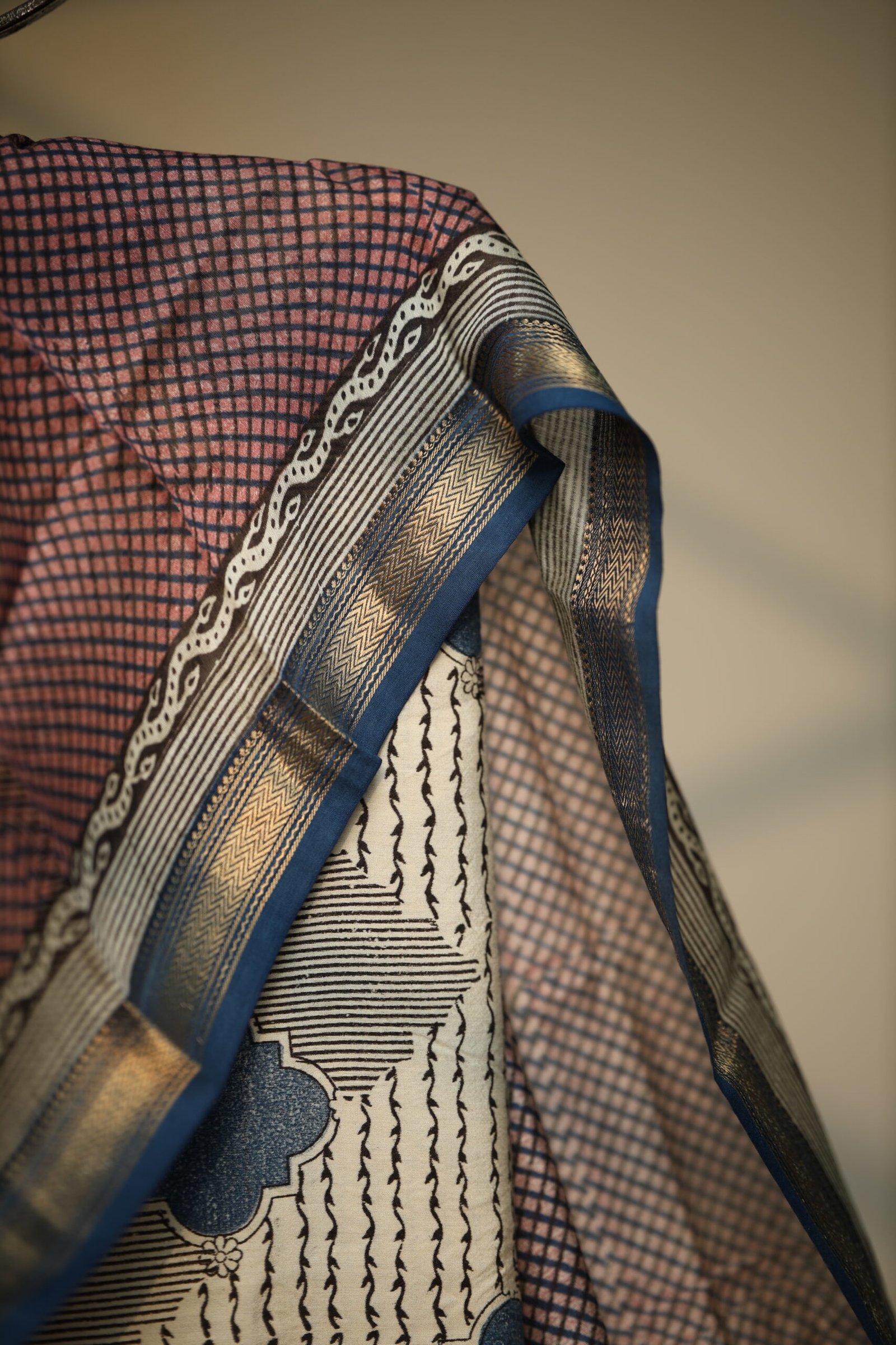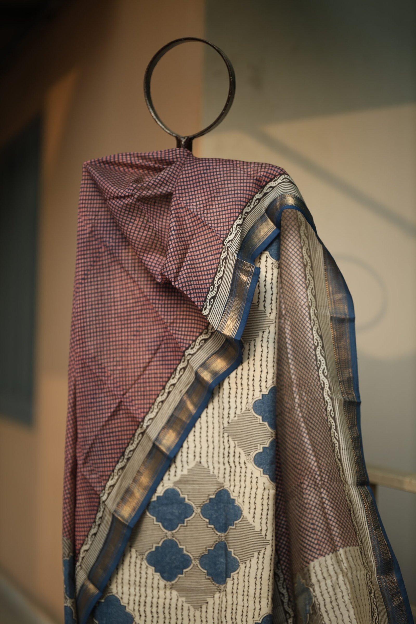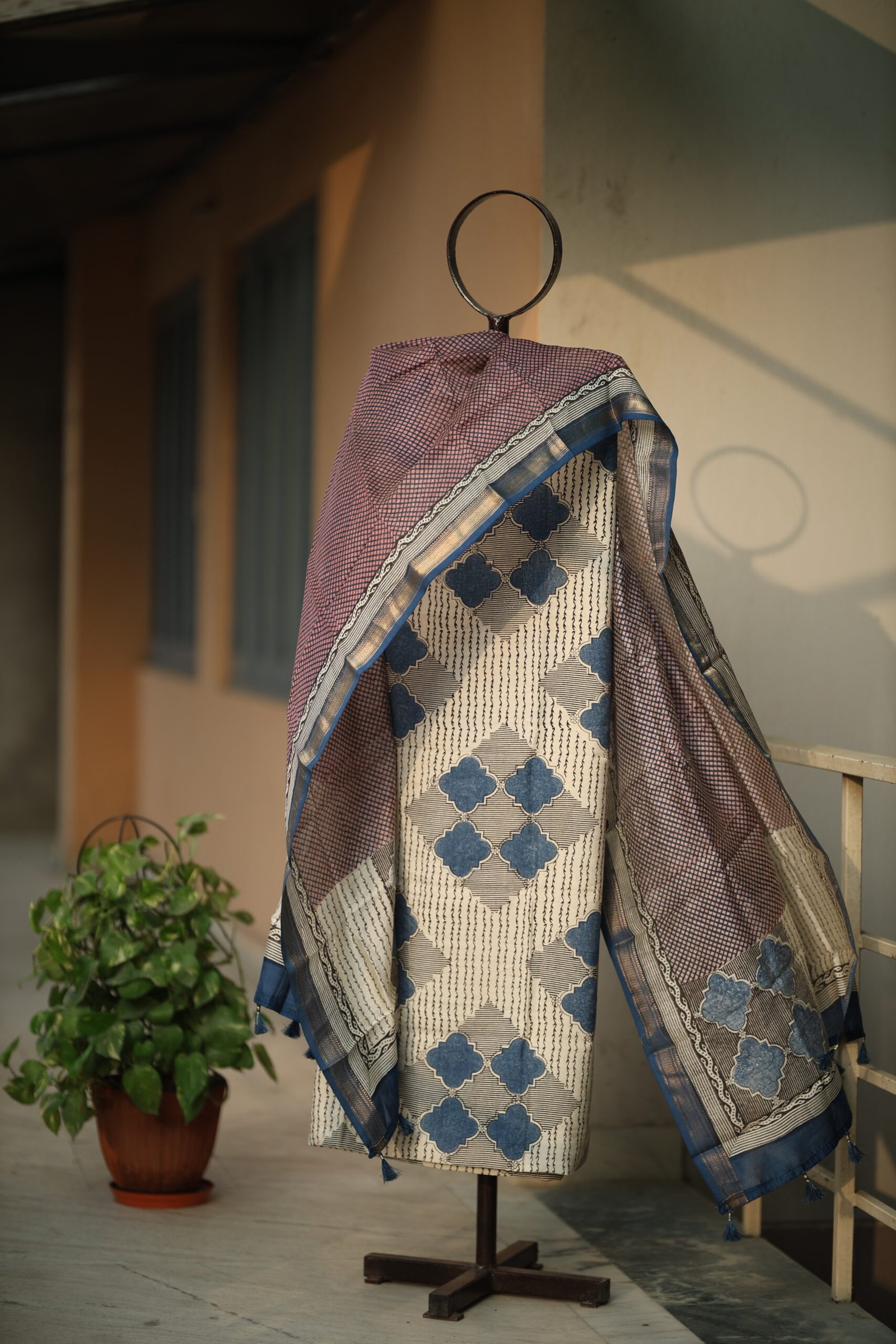 This Chanderi two-piece unstitched suit set is a celebration of soft heritage hues and refined design. The calming off-white base paired with dusty blue motifs creates a visually soothing palette that feels both classic and contemporary. The contrast border adds definition, while the dupatta completes the look with coordinated patterns and gentle movement.