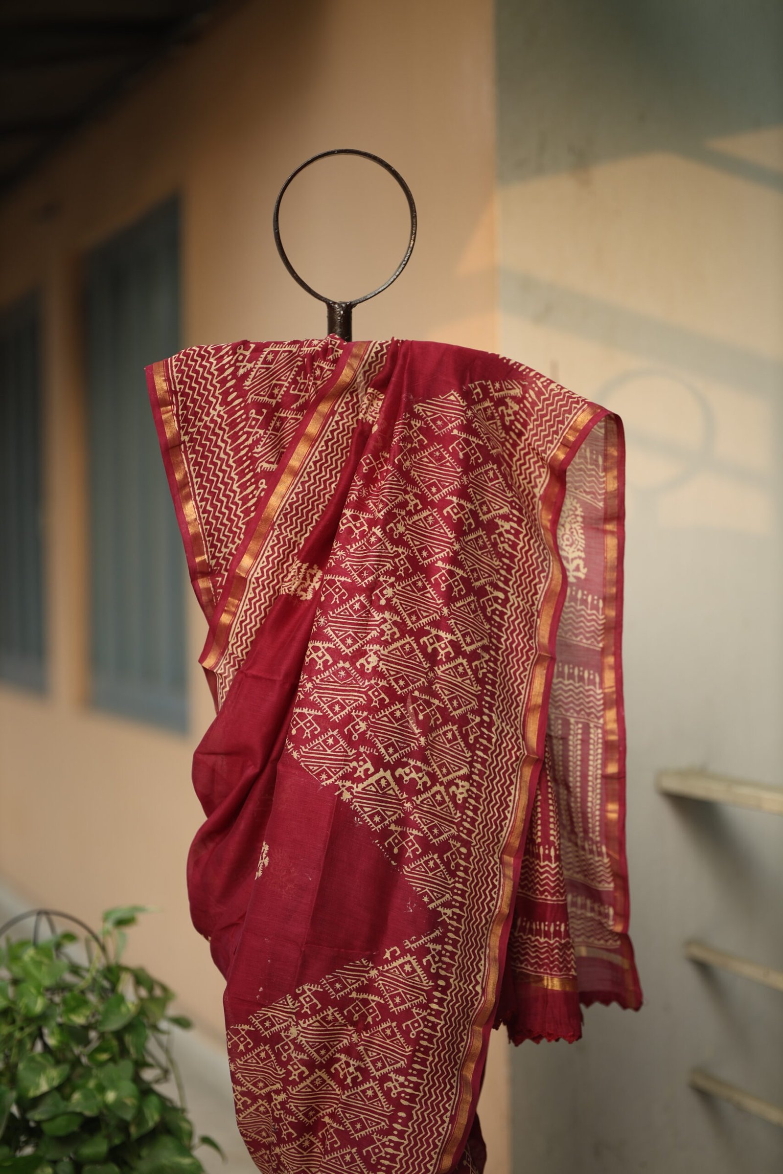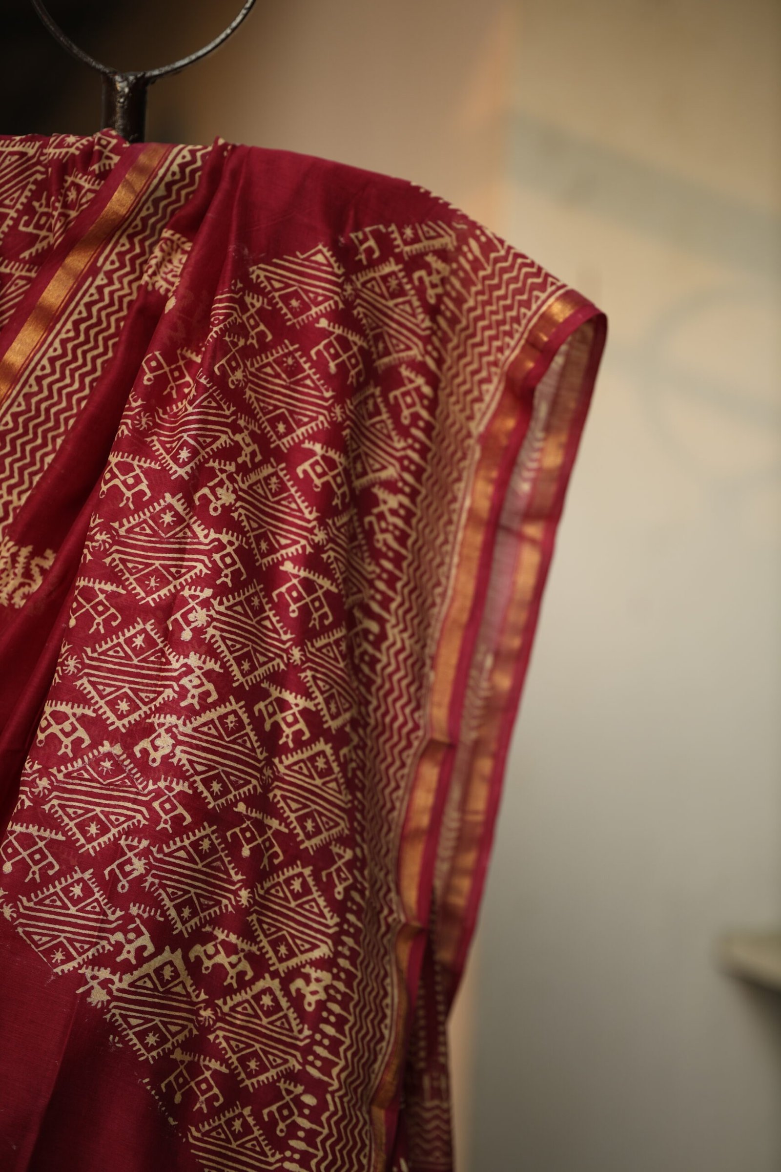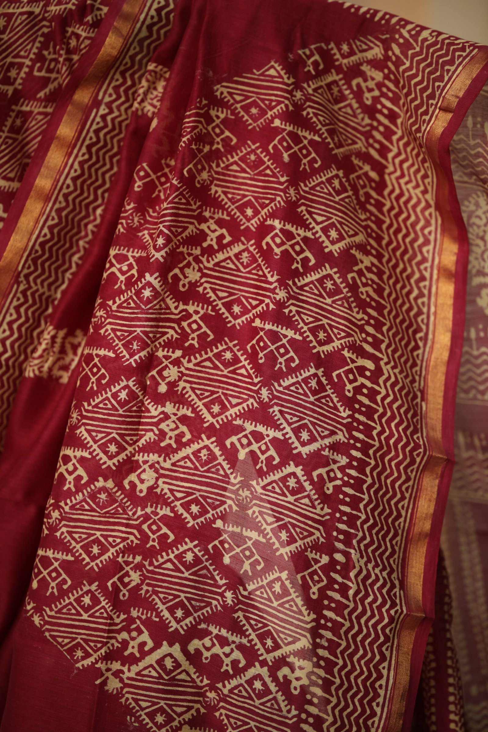 Woven in fine, airy Chanderi, these blue and maroon sarees celebrate the beauty of Bagru-style discharge block printing, a time-honoured craft rooted in Rajasthan. Hand-carved wooden blocks create rhythmic patterns of geometric bands, folk-inspired motifs, and traditional borders, gently revealed through the discharge process. The result is a soft, lived-in elegance where the motifs appear organically embedded into the fabric rather than sitting on the surface.