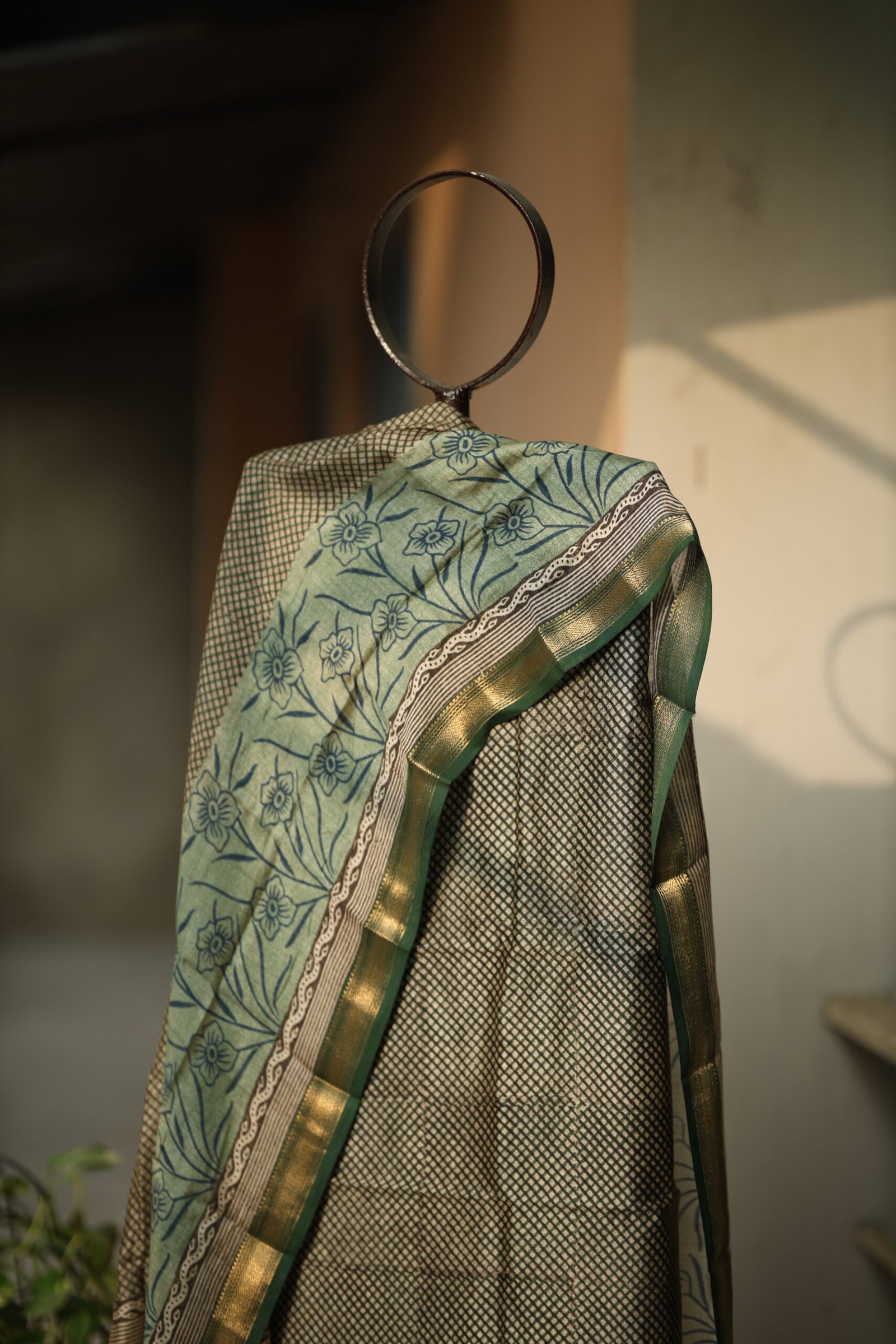 This serene Chanderi two-piece suit set is designed in a calming off-white and sage green color palette, adorned with delicate floral patterns that exude effortless elegance. The subtle border detailing with muted metallic accents enhances the overall look while keeping it soft and understated.