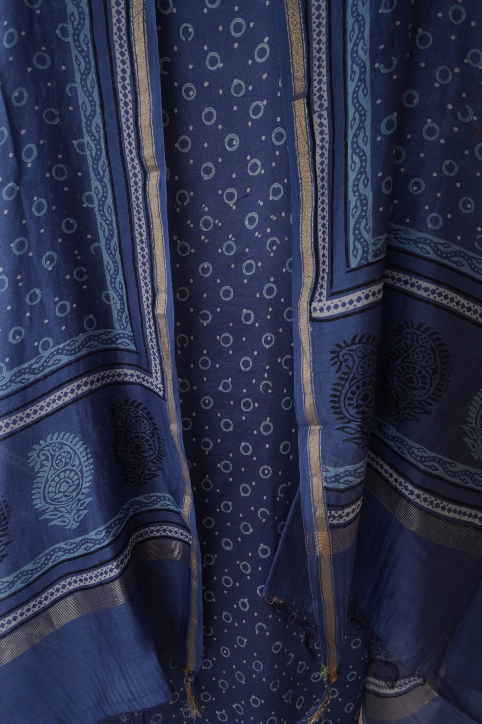 - Aesthetic: Classic, regal, and high-contrast. The Chanderi fabric’s natural sheen enhances the deep indigo tones, making the discharged white motifs pop with clarity.