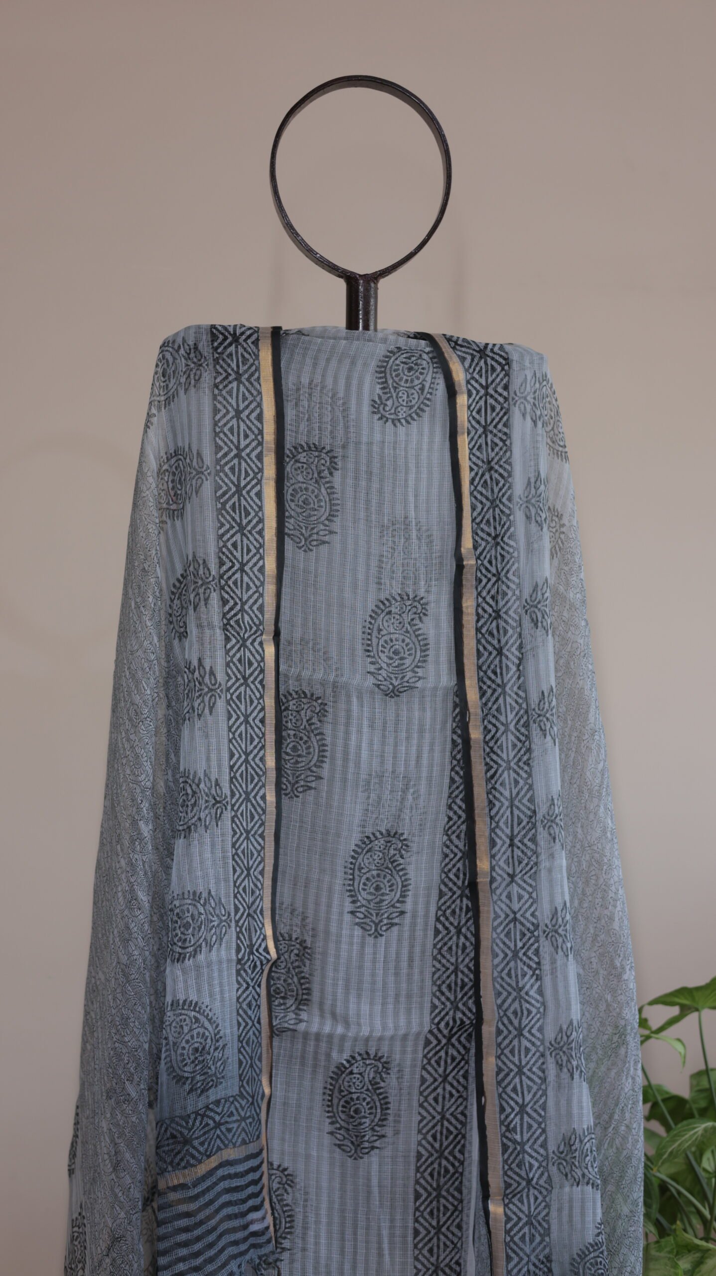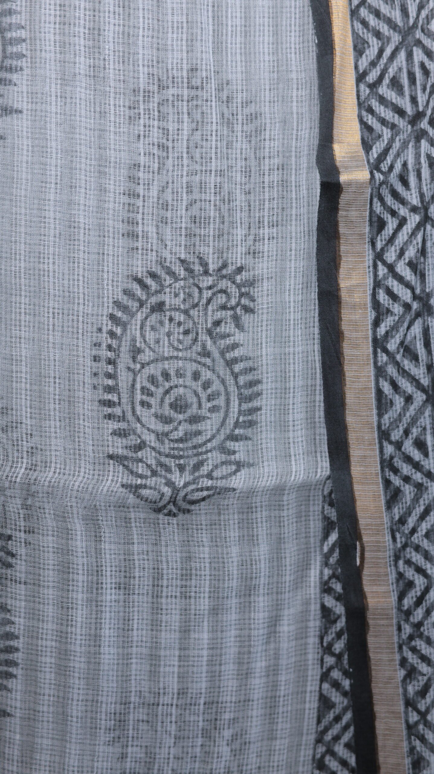 This ensemble presents a sophisticated, monochromatic look that highlights the delicate “khat” weave of the Cotton Kota Doria fabric. The design features a moody, charcoal-grey tie-dye base that provides a modern, clouded backdrop for the intricate block print artistry.