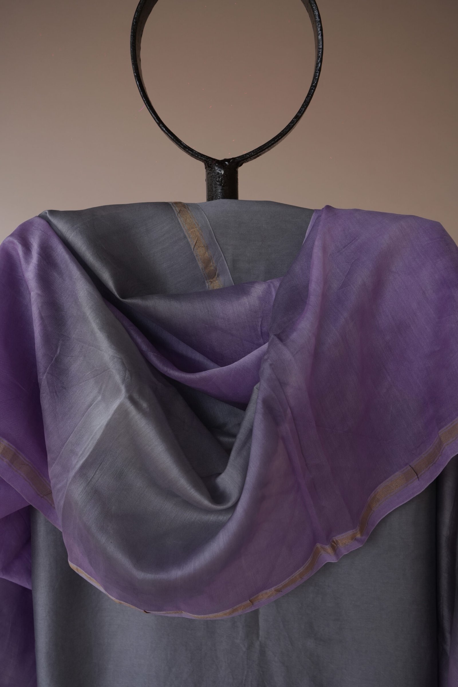 The dupatta flows in soothing lavender tie-dye Chanderi, finished with a fine zari border and tassel details, lending movement and a gentle festive glow. A breathable cotton bottom in soft lavender completes the set, making it ideal for long day celebrations and intimate festive gatherings.