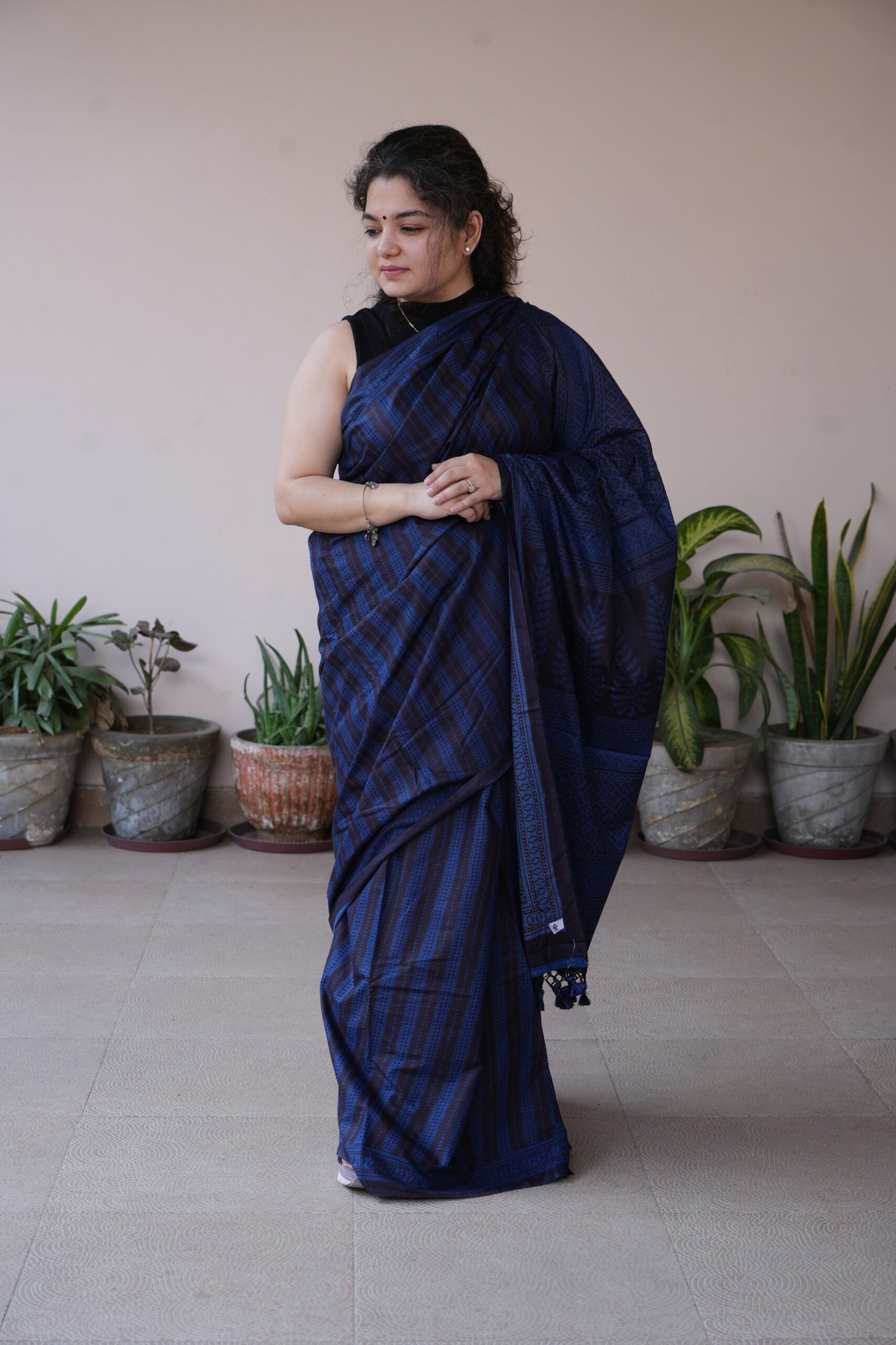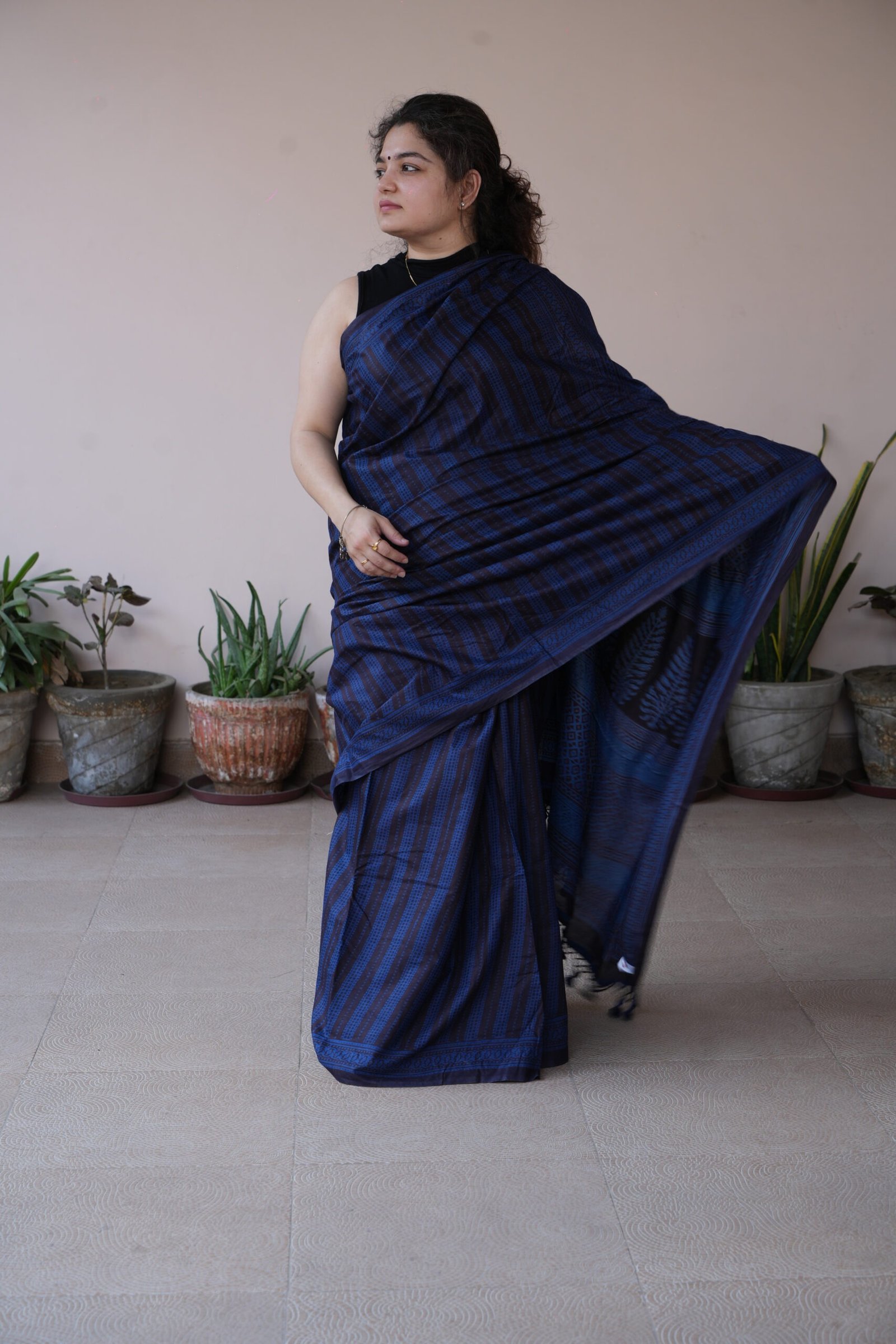 Crafted on feather-soft mul cotton, this saree carries fine hand block printed vertical and checkered jaal patterns, created using natural vegetable dyes. The deep indigo body is beautifully framed with a classic geometric Bagh border and intricately detailed pallu ,