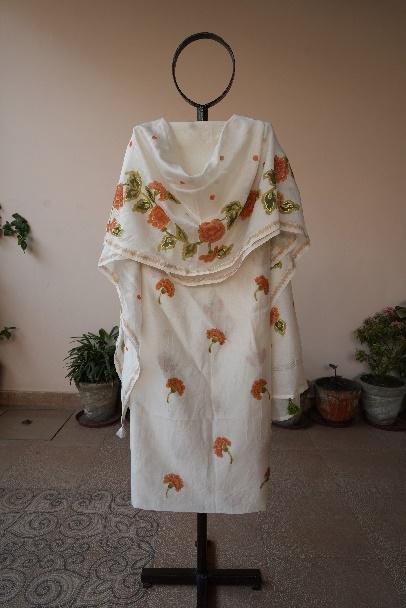 The kurta features floral placements that balance elegance and ease, while the dupatta is detailed with a handpainted jaal border of genda flowers, adding rhythm and visual continuity to the design. The natural sheen and lightweight drape of Chanderi allow the artwork to stand out while ensuring breathable comfort.