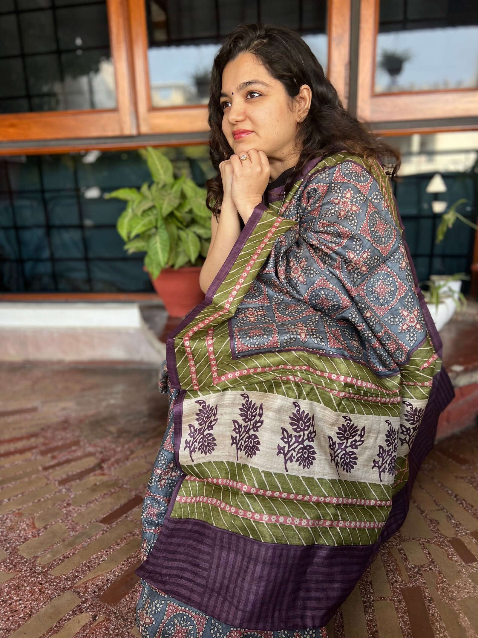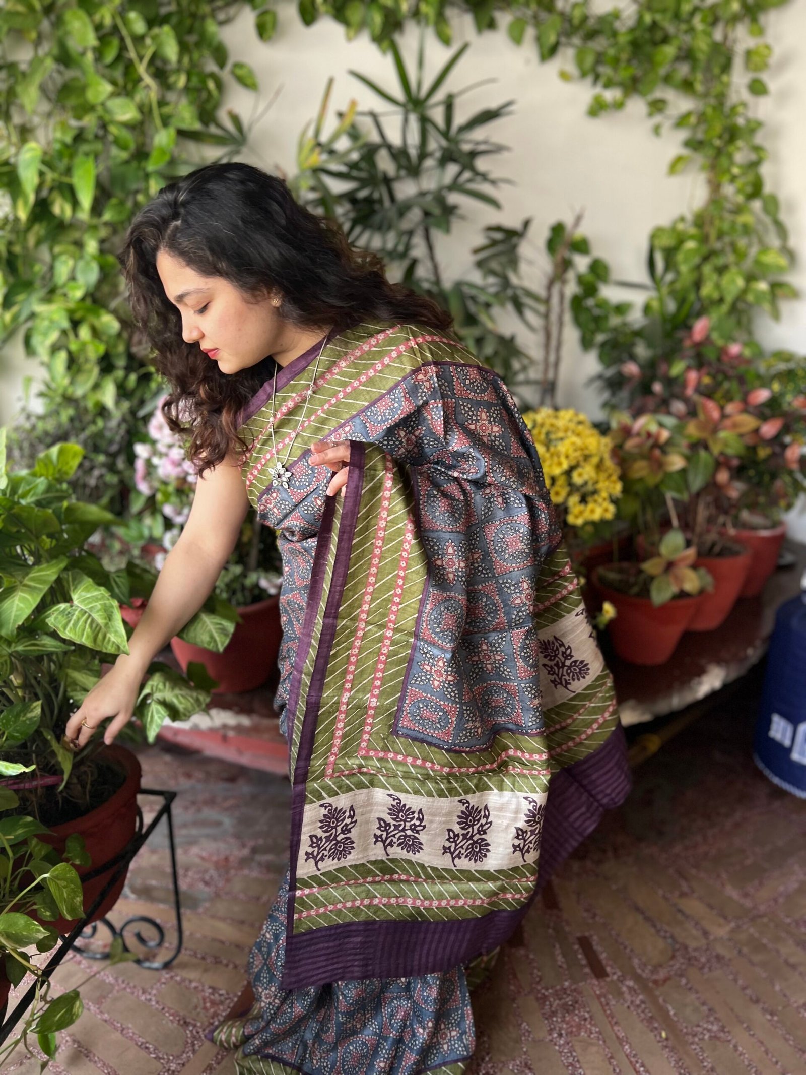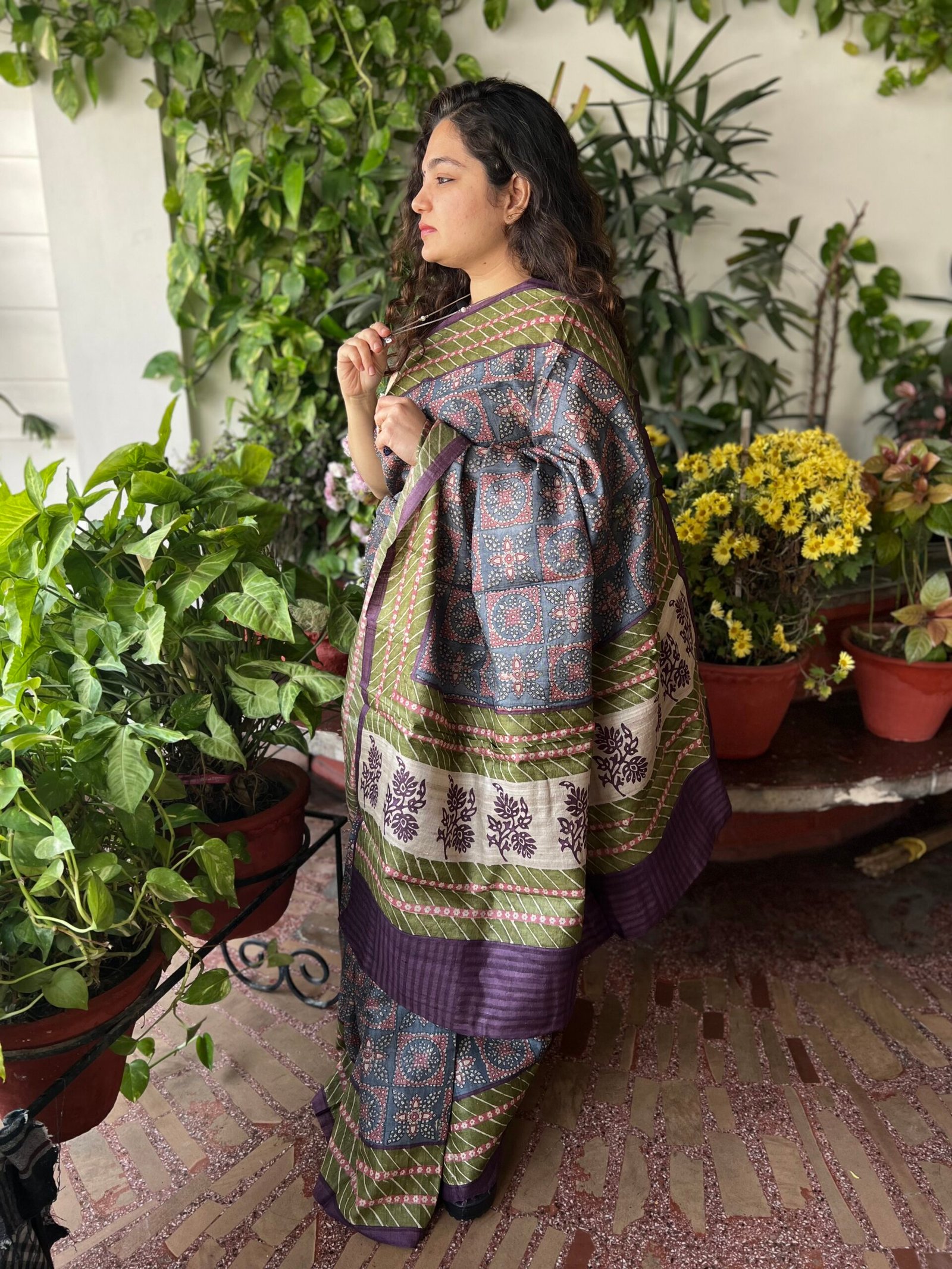 A soulful Bhagalpuri tussar saree featuring Bandhej-inspired hand block motifs in rich blue and purple hues, beautifully balanced with an olive-toned border that adds depth and earthiness to the drape.
