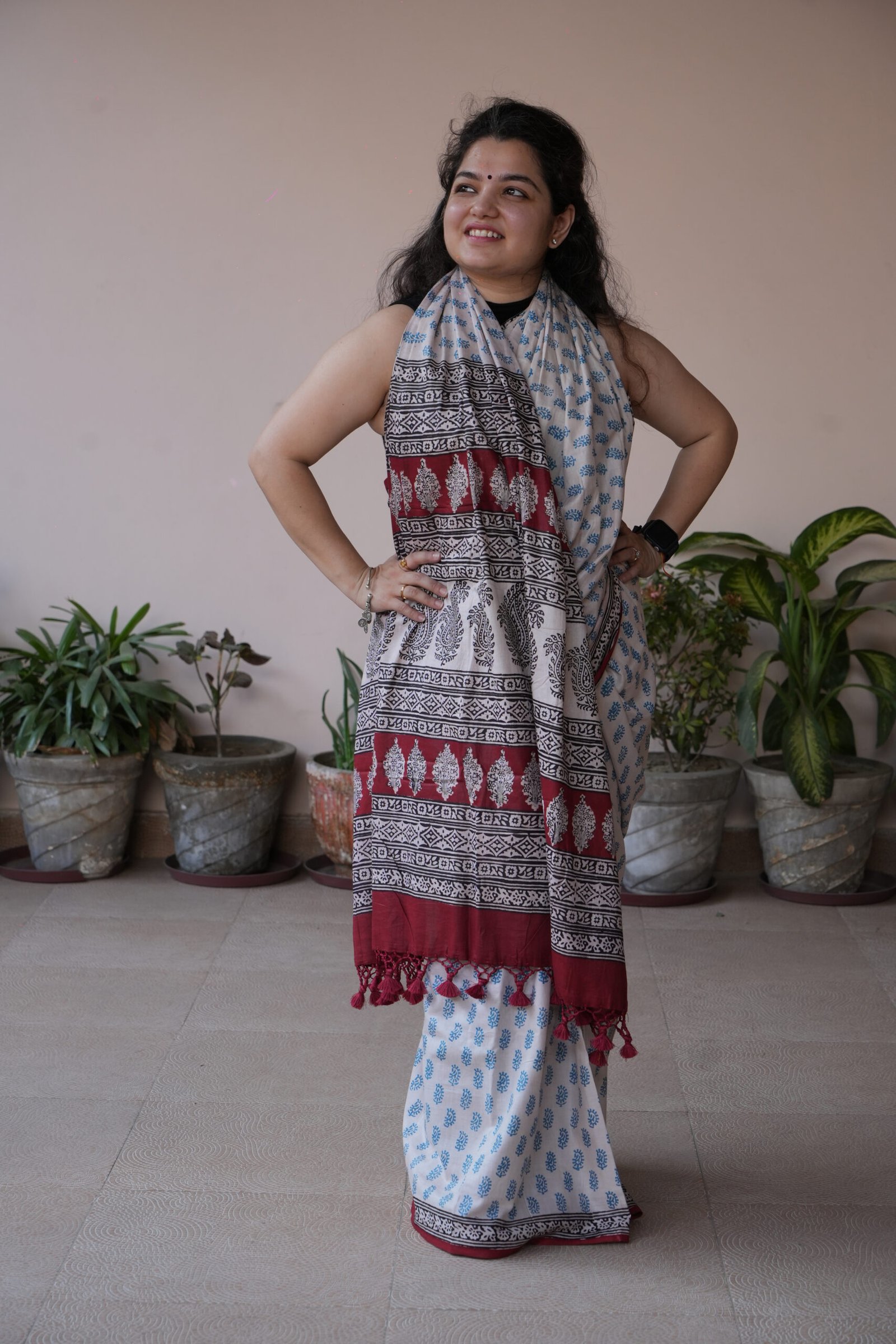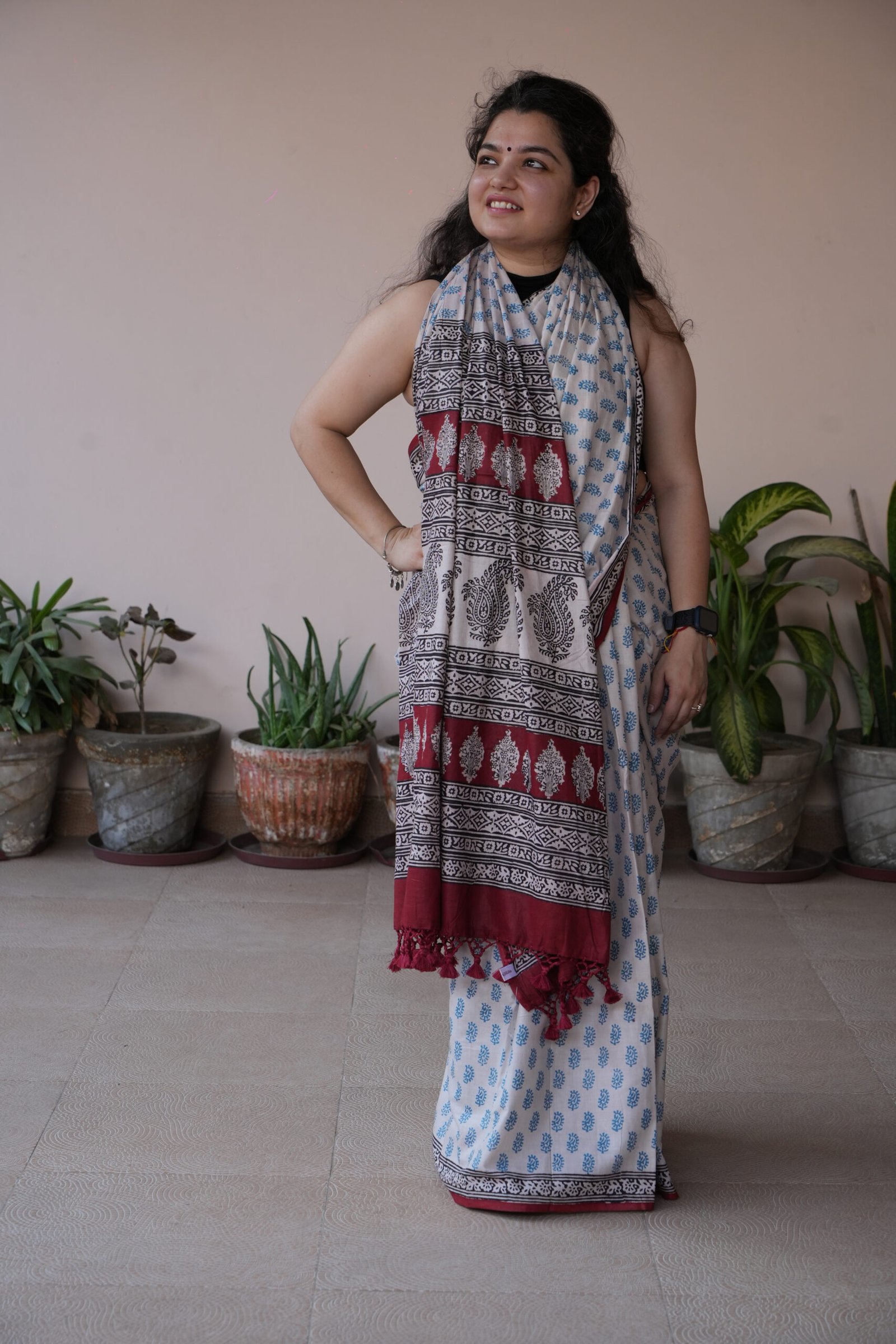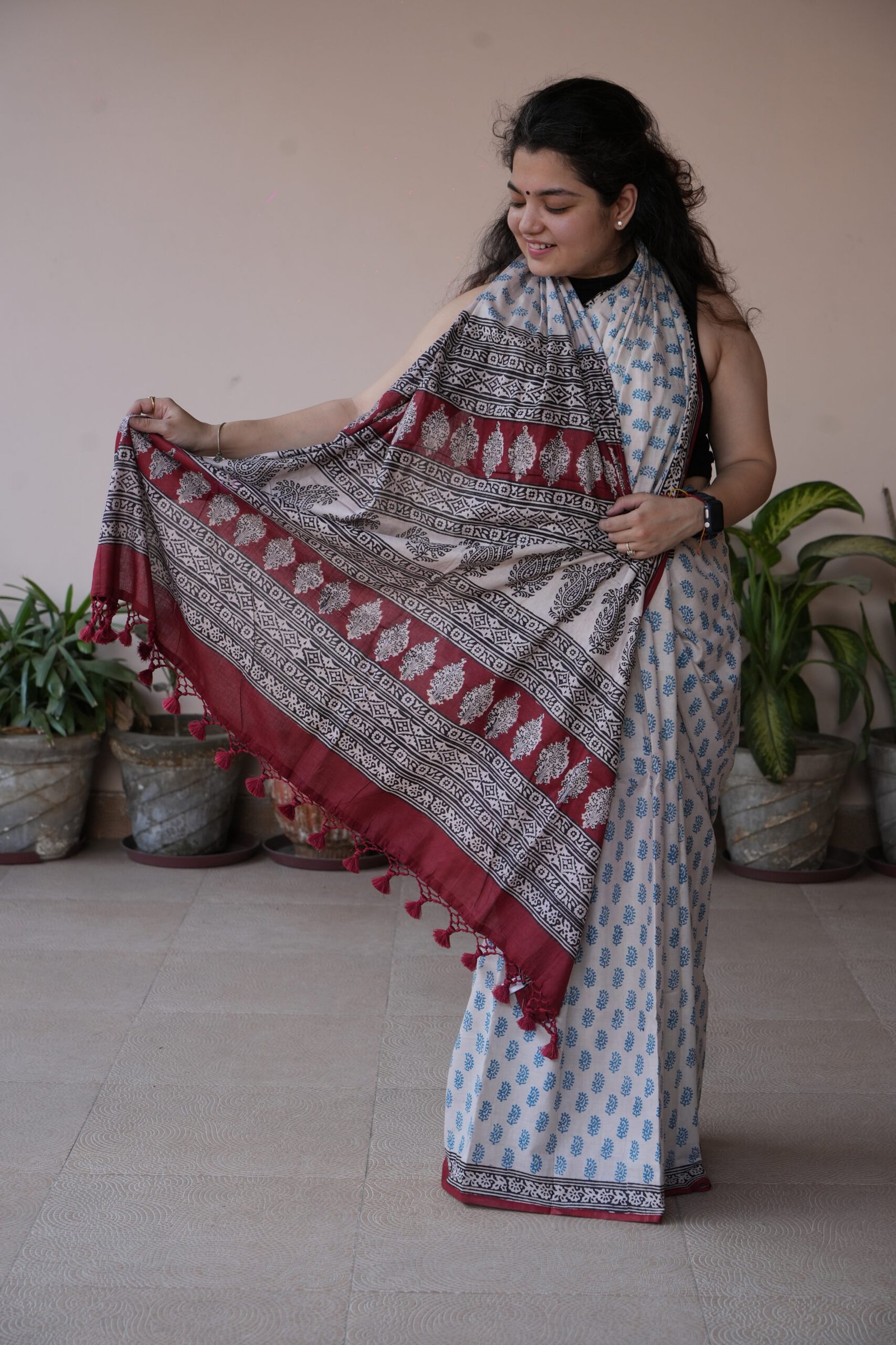 Syahi Bagh is a timeless expression of classic Bagh artistry rendered on feather-soft cotton mul. This saree celebrates the heritage of natural dye printing, where deep indigo and rich maroon are layered over an ivory base to create striking geometric borders and delicate floral bootis.