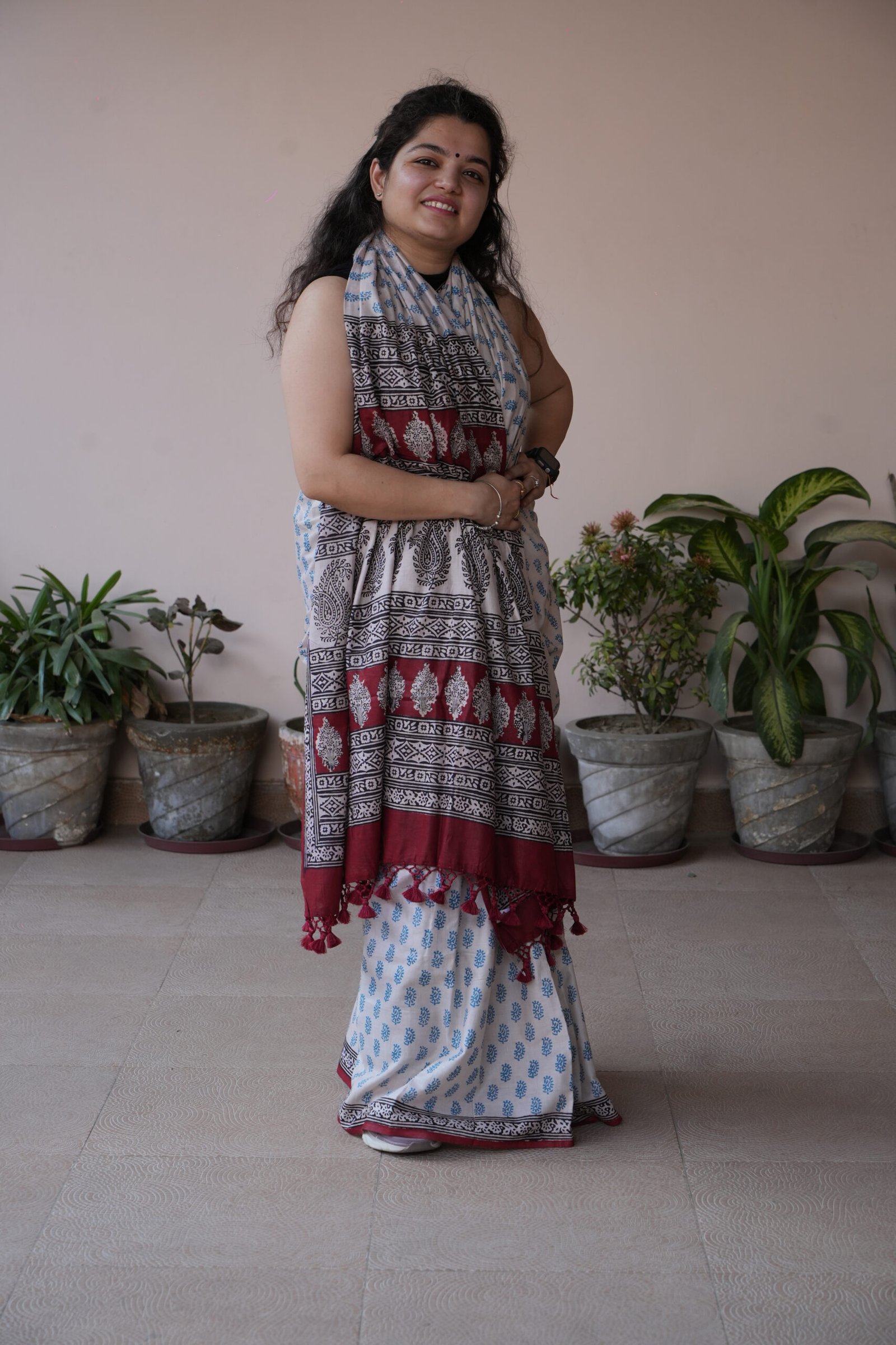 The pallu is adorned with traditional Bagh jaal panels and bold temple-style motifs, finished with handcrafted tassels in deep maroon — adding an artisanal charm to every drape. Breathable, lightweight and fluid, this saree is perfect for everyday elegance, office wear, and summer festivities.