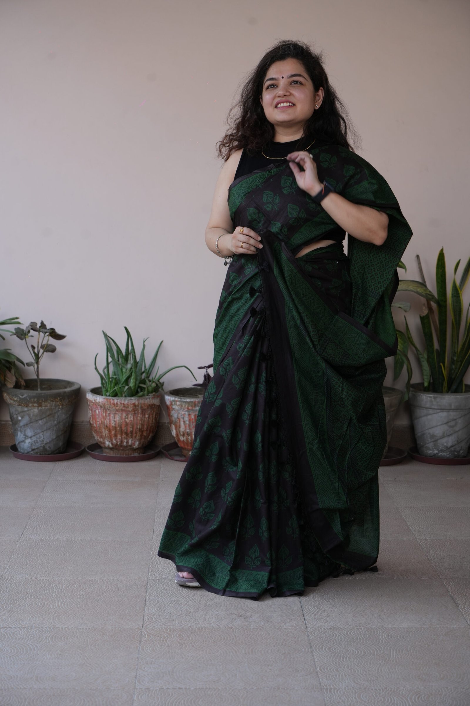 Vanika is a bold, earthy interpretation of Bagh on cotton mul. Featuring an all-over hand-printed leaf jaal in deep forest green over a rich black base, this saree draws inspiration from the lush forests of the Malwa region.